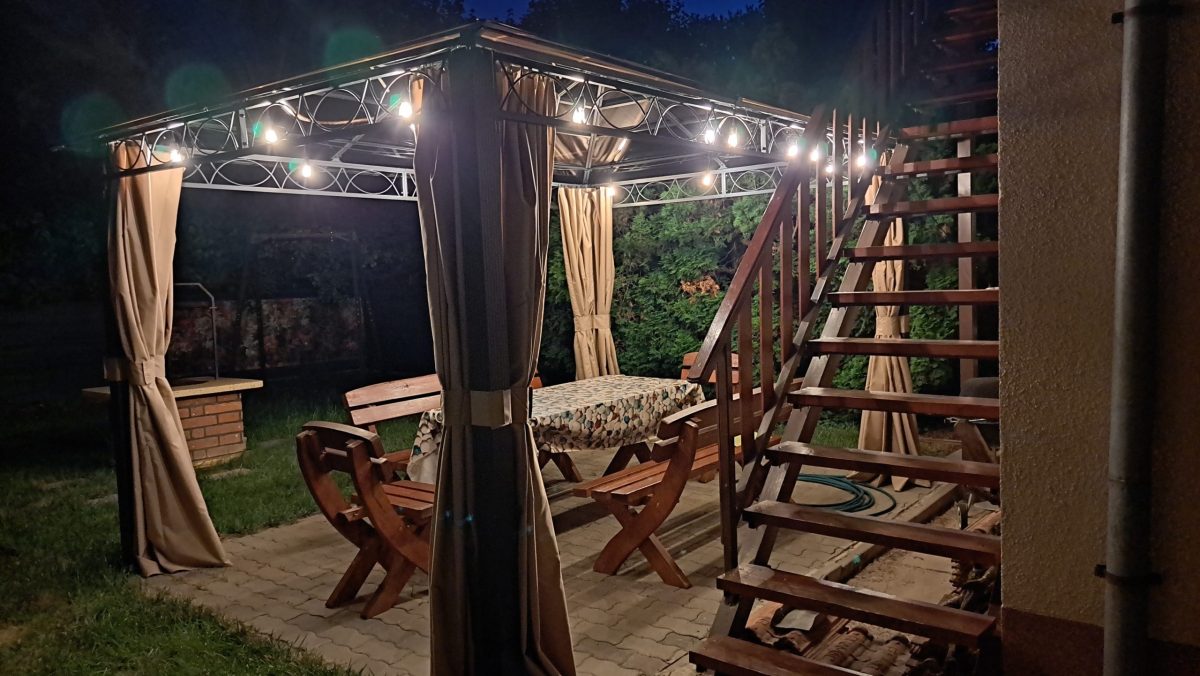 A kertben a ház mögött eldugva nagy kövezett teraszon a napvitorla alatt üldögélhetsz a tömörfa kerti asztal mellett, süthetsz tárcsán, vagy bográcsozhatsz. Ha csak lazulnál, akkor a napozóágyakra vagy akár közvetlenül fűbe heveredve bámulhatod az eget, és hallgathatod a csendet. 😊